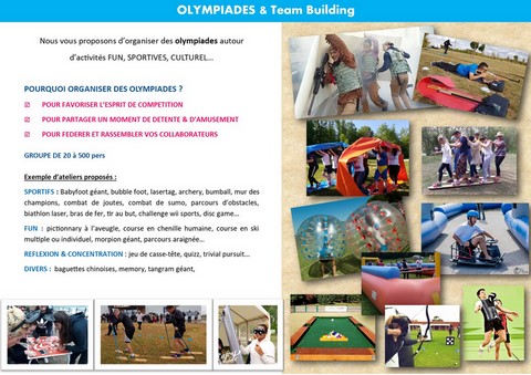 Nous étudions et gérons avec vous vos olympiades et team building. Vous choisissez les animations que vous souhaitez, nous vous présenterons la liste de nos partenaires, les buffets ou repas, les sites, les salles de réunions, les terrains, l'hébergement, nous vous apporterons un maximum de notre aide.