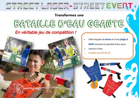 L'animation WATER BATTLE est un peu comme un lasergame, mais en bataille d'eau, aussi appelée WATER TAG. Le kit comprend des plastrons, des gilets en plastique équipés d'une jauge avec une balle pour rapidement voir le niveau. Les participants, armés de pistolets à eau de différentes formes et tailles, doivent remplir d'eau les gilets de adversaires pour les éliminer du jeu.