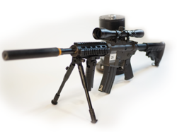 Réplique de M4 équipée d’une lunette de précision. Utilisable avec un chargeur à air comprimé pour plus de réalisme.